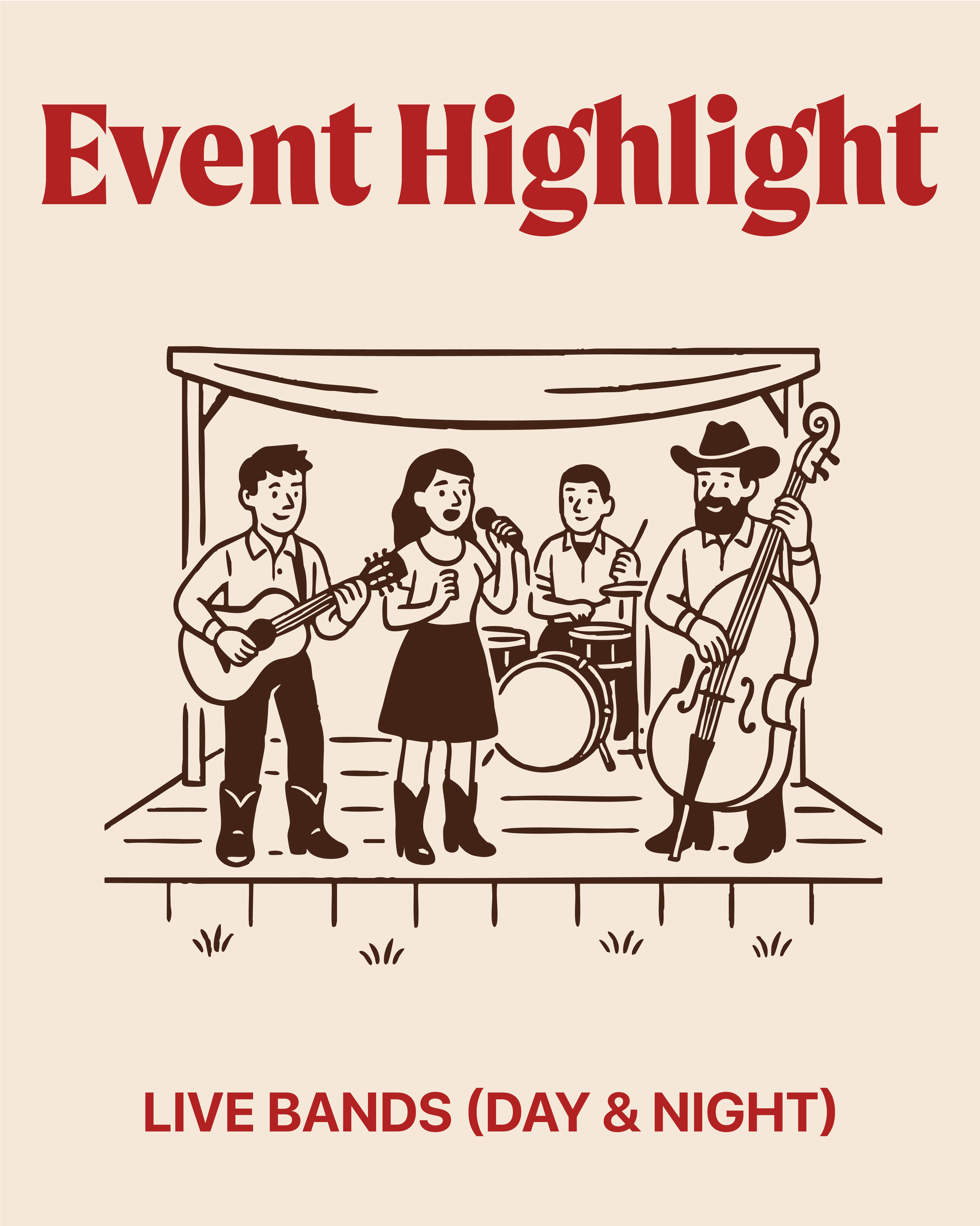 Families can enjoy the petting zoo and jumping castle, while the brave can take on the mechanical bull or cheer on the whip cracking demo. Dress your best for the Best Dressed Cowboy & Cowgirl competition, and soak up the festival atmosphere with games, laughter, and local flair all day long.